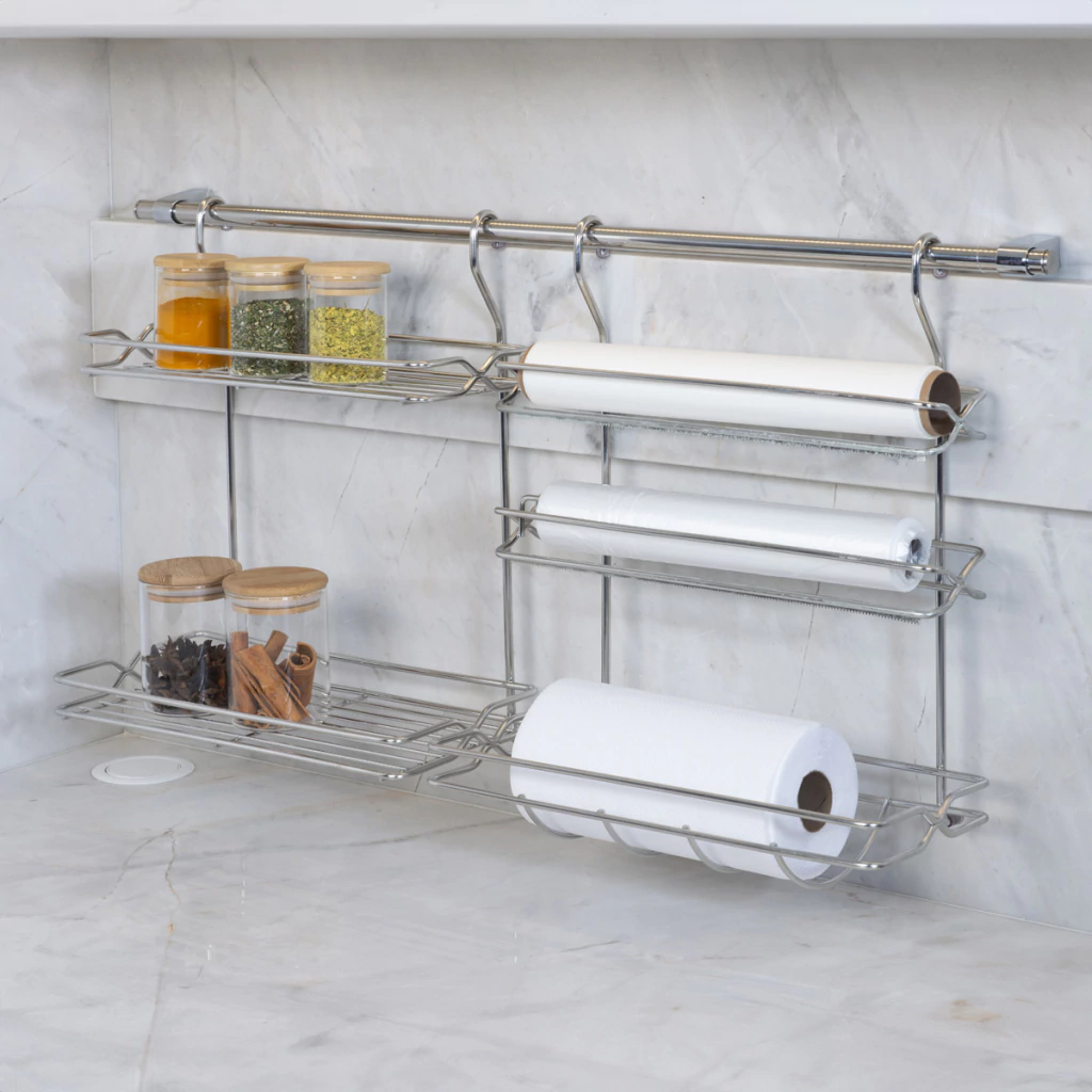 É um kit composto por barra tubular, suporte porta-rolos, suporte para condimentos de 2 níveis, e ganchos multiuso.